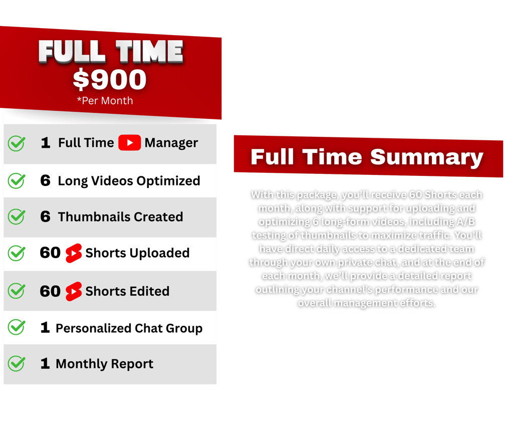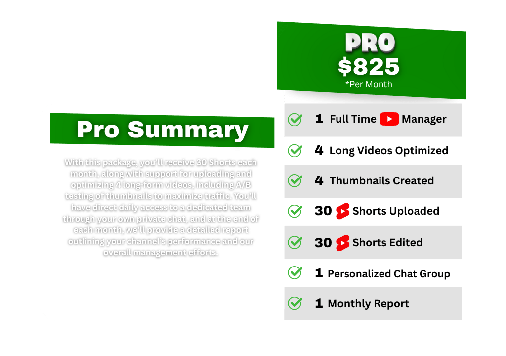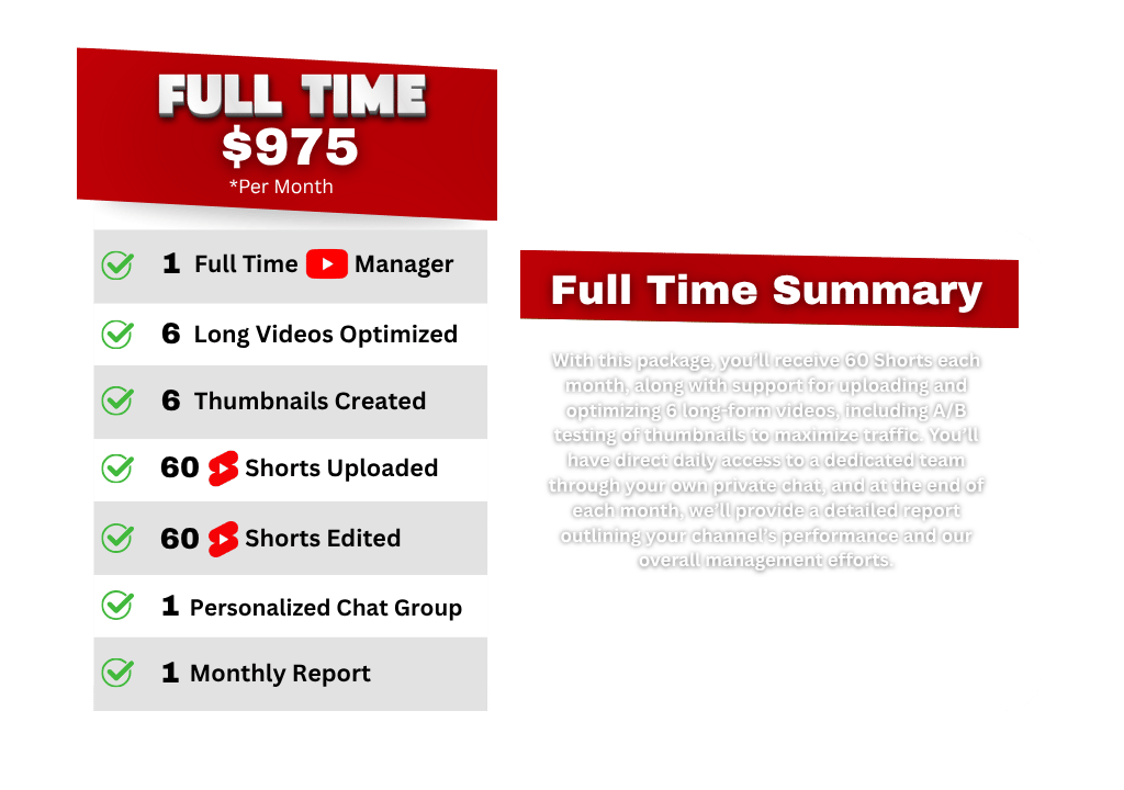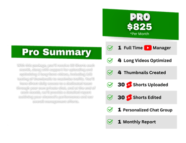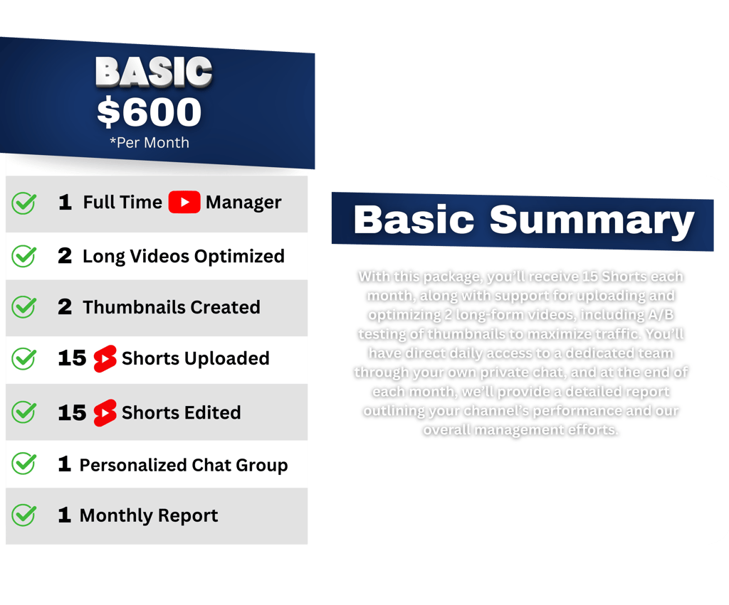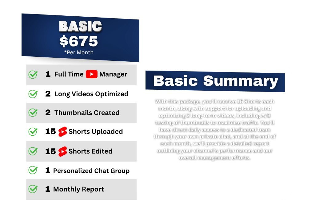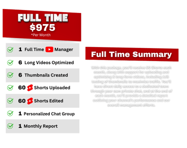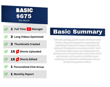 Our tailored packages are meticulously crafted to ensure the success of each client. Whether you need Video editing, comprehensive management, channel creation, or branding services, we offer a versatile range of solutions to elevate your brand's marketing strategy and enhance its presence on YouTube.