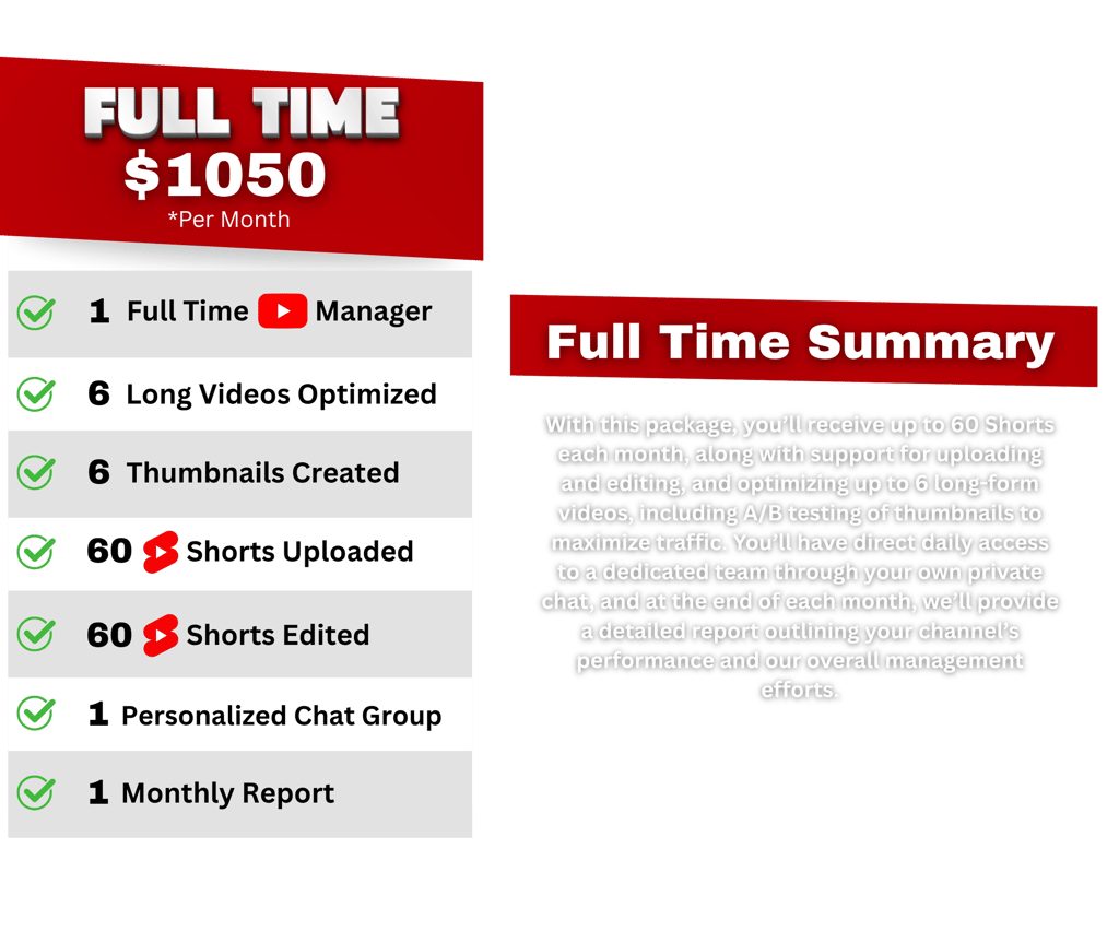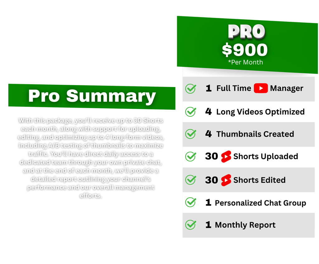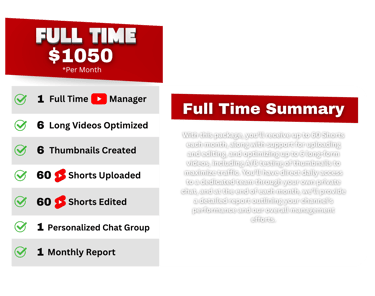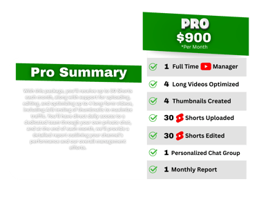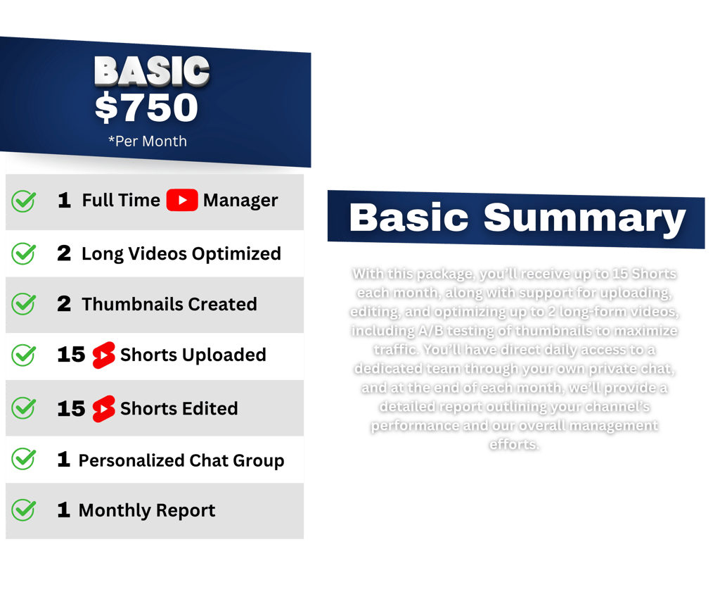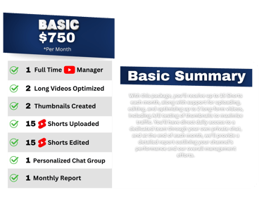 Our tailored packages are meticulously crafted to ensure the success of each client. Whether you need Video editing, comprehensive management, channel creation, or branding services, we offer a versatile range of solutions to elevate your brand's marketing strategy and enhance its presence on YouTube.